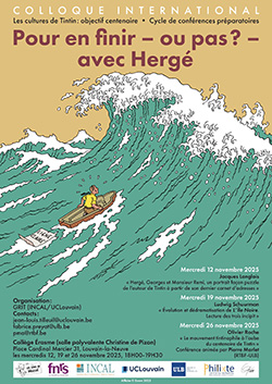 Les administrateurs des ADH ont décidé de soutenir l’organisation de ce colloque, mais chacune et chacun, selon ses moyens, peut individuellement participer à la campagne et la relayer auprès de ses réseaux. Rappelons que dans le cadre de la préparation de ce colloque, trois ADH donneront bientôt des conférences à l’Université catholique de Louvain : le mercredi 12 novembre à 18 heures, Jacques Langlois présentera Hergé, Georges et Monsieur Remi, un portrait façon puzzle de l’auteur de Tintin à partir de son dernier carnet d’adresses ; le mercredi 19 novembre à 18 heures, Ludwig Schuurman proposera Évolution et dédramatisation de L’Île Noire. Lecture des trois incipit. Enfin, le mercredi 26 novembre, toujours à 18 heures, Olivier Roche se penchera avec Pierre Marlet sur Le Mouvement tintinophile à l’aube du centenaire de Tintin.