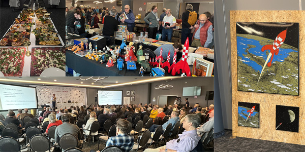 Notre 41e Journée annuelle a été, une fois de plus, un franc succès : avant même l’heure d’ouverture, la foule des collectionneurs se pressait aux portes des salons accueillant la bourse tintinophile. Durant la matinée, plus de 350 membres sont passés à l’accueil pour prendre la magnifique affiche signée Olivier Schwartz. La salle d’exposition a aussi vu de nombreux visiteurs. Les deux conférences du matin et la séance de l’après-midi ont été suivies par un public aussi dense qu'attentif, écoutant avec recueillement et émotion l’hommage rendu à Philippe Goddin, plus particulièrement les mots de sa fille Stéphanie venue annoncer que les archives de son père seront désormais abritées par le Centre belge de la Bande Dessinée. Parmi les séquences prévues au programme, toutes de grande qualité, il faut mentionner cet autre grand moment, hélas trop court, que fut la table ronde réunissant la famille de Bob De Moor et Gilles Ratier, l'auteur d’une monumentale monographie en l’honneur du dessinateur et de son œuvre. Après une séance de dédicaces, marquée par la mise en vente du beau hors-série consacré à Philippe Goddin (lire ci-dessous), le traditionnel dîner de gala a rassasié et réjoui ses 160 convives.